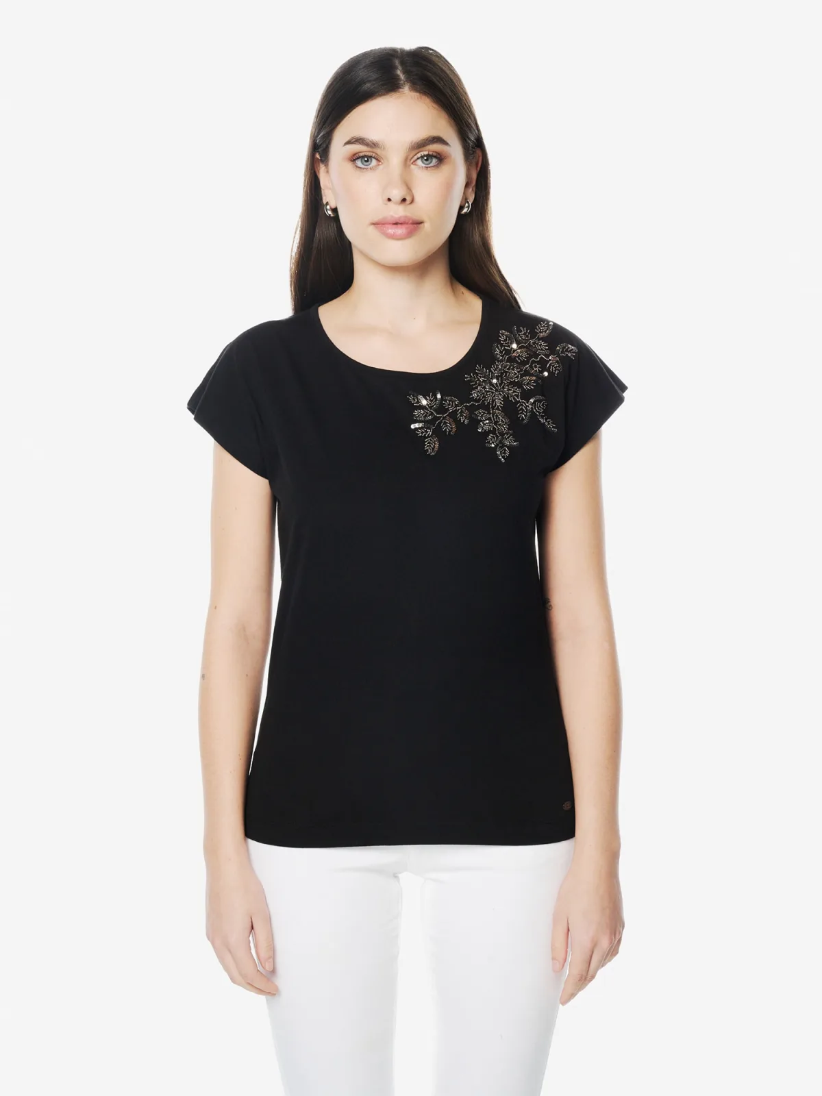 Design: Gevoerde zoom/rand; Materiaal: Jersey; Halstype: Ronde hals; Motief: Bloemenprint; Details: Pailletten; Extra's: Applicaties; Pasvorm: Normale pasvorm; Armlengte: Kwartmouw; Lengte: Normale lengte