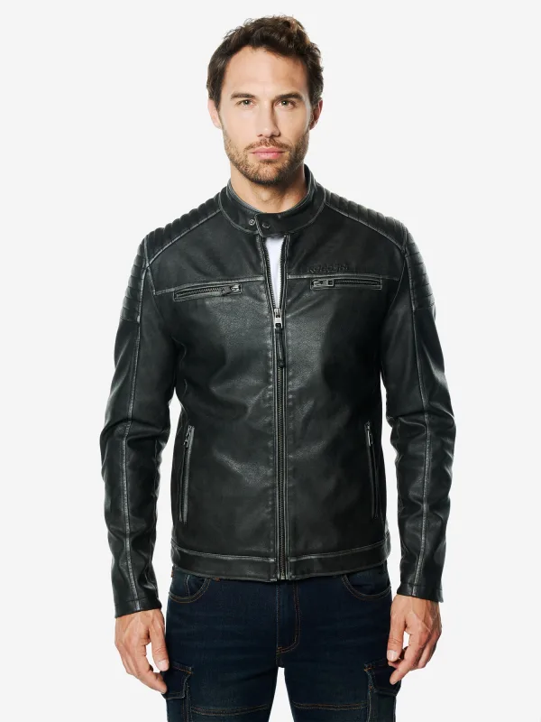 Design: Mouw rits, Ritszakken aan de zijkant; Type sluiting: Ritssluiting; Type jas: Bikerjack; Voering: Licht gevoerd; Materiaal: Imitatieleder; Motief: Logoprint; Extra's: Stiksels, Ellenboog patches; Pasvorm: Normale pasvorm