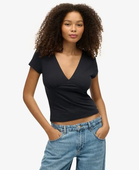 Slimfit - de nauwsluitende pasvorm zorgt voor een meer geklede look V-hals met ruches op de borst Mouwen met capuchon en een korte pasvorm Elastische geribde achterkant Kenmerkende geborduurde tekst op de zoom De korsettop met kapmouwtjes is een prachtige stylingessential. Ontworpen met ruches op de borst en kapmouwtjes. Het silhouet is trendy en chique, zodat je het kunt combineren met een jeans of rok voor een prachtige, ingetogen look.