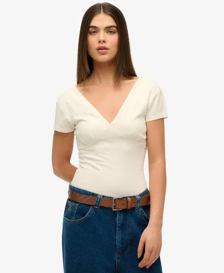 Design: Gevoerde zoom/rand, Rechte zoom, Diepe snit/decolleté; Materiaal: Jersey; Halstype: V-hals; Motief: Effen; Details: Gedrapeerd; Extra's: Op staal naden, Voelt zacht aan; Pasvorm: Slanke pasvorm; Armlengte: Kwartmouw; Lengte: Korte pasvorm