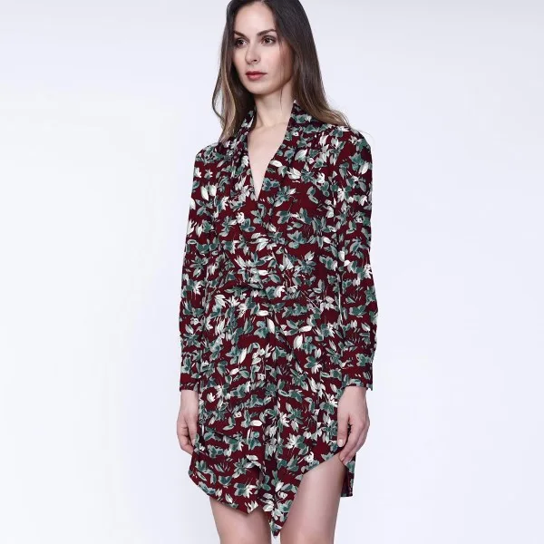 Zeer modern item met zijn gedrapeerde snit die begint vanaf de schouder en op de heup terechtkomt, onderstreept door een minimalistische knop. Een asymmetrische zoomlijn die een atypische snit voltooit; Dit statement -stuk geeft je garderobe energie. Kan worden gedragen als een korte jurk of als een tuniek over een paar leggins. Eenvoudig te strijken, verkrijgbaar in een bloemenprint in herfstkleuren. Productdetails : Vorm: recht, taille enigszins gemonteerd Lengte: 93 cm vooraan, kort Lange mouwen V Splitsing
