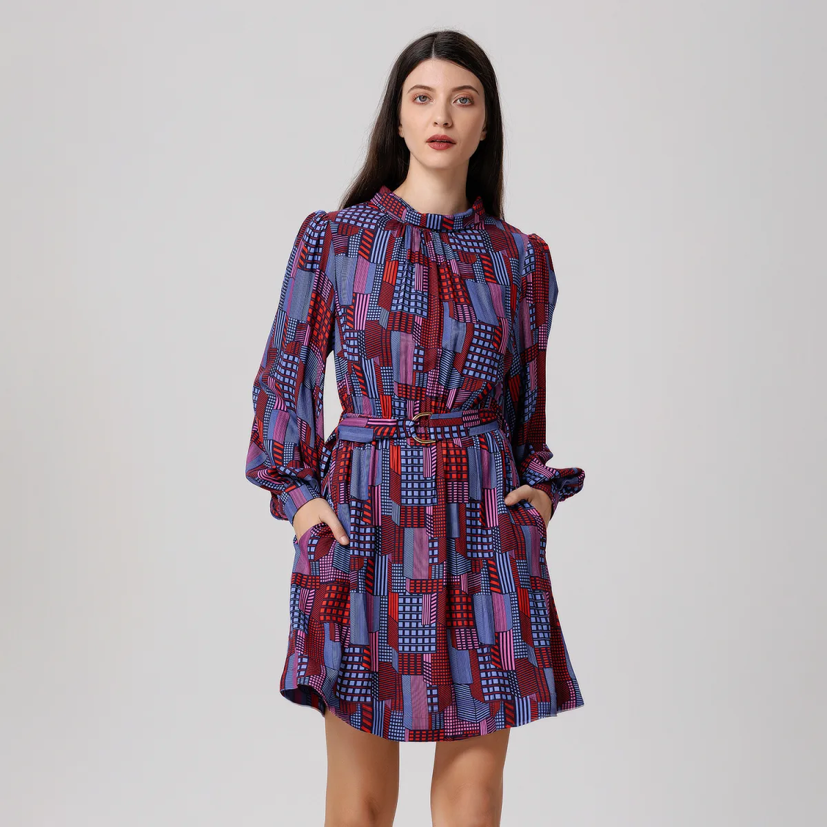 Een licht retro exemplaar met verfijnde details: omgeslagen opstaande kraag, pofmouwen, toegevoegde riem. Aansluitende taille, wijd uitlopend volume, overhemdmouwen. Een grafisch en vrouwelijk exemplaar in een geometrische patroonprint, voor semi-formele gelegenheden zoals ontmoetingen met vrienden, op kantoor of een avondje uit. Vorm: schaatser Lengte: 91 cm Opstaande kraag Lange mouwen met manchetten met knopen Kraag met knoop middenachter