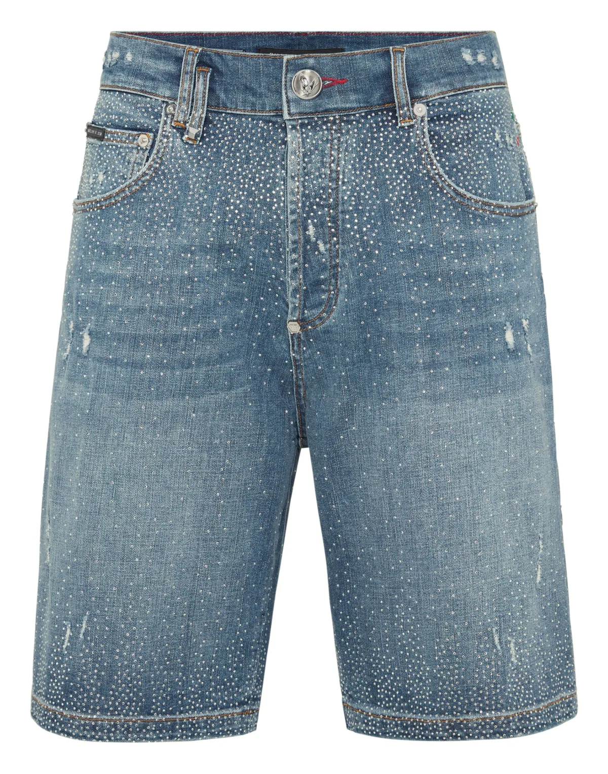 Verfraaid Forget about the routine and choose something totally original like these denim bermudas with a strong character. Used effect denim Rhinestones decoration Single metal button Logoed patch sewn on the back Fit: Formentera