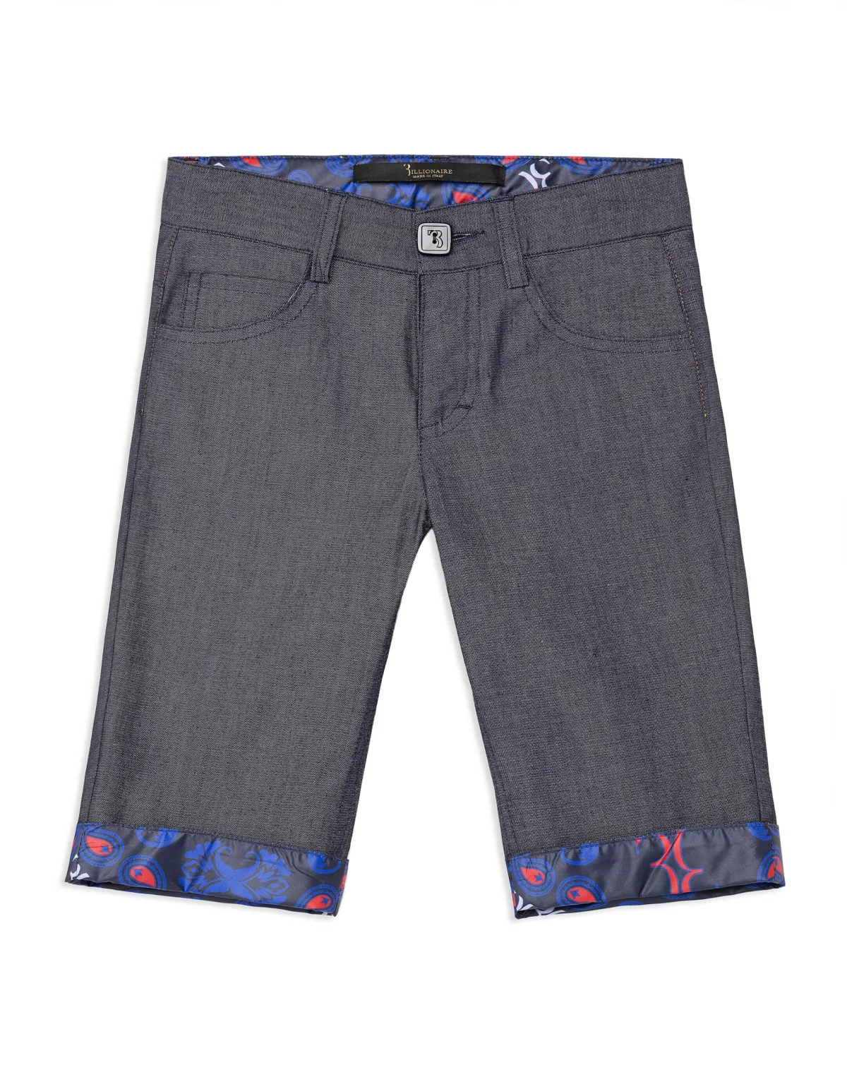 Cotton chambray five pockets bermuda trousers. Embroidered crest at right back pocket. Button fastening. Pleated and lined bottom.