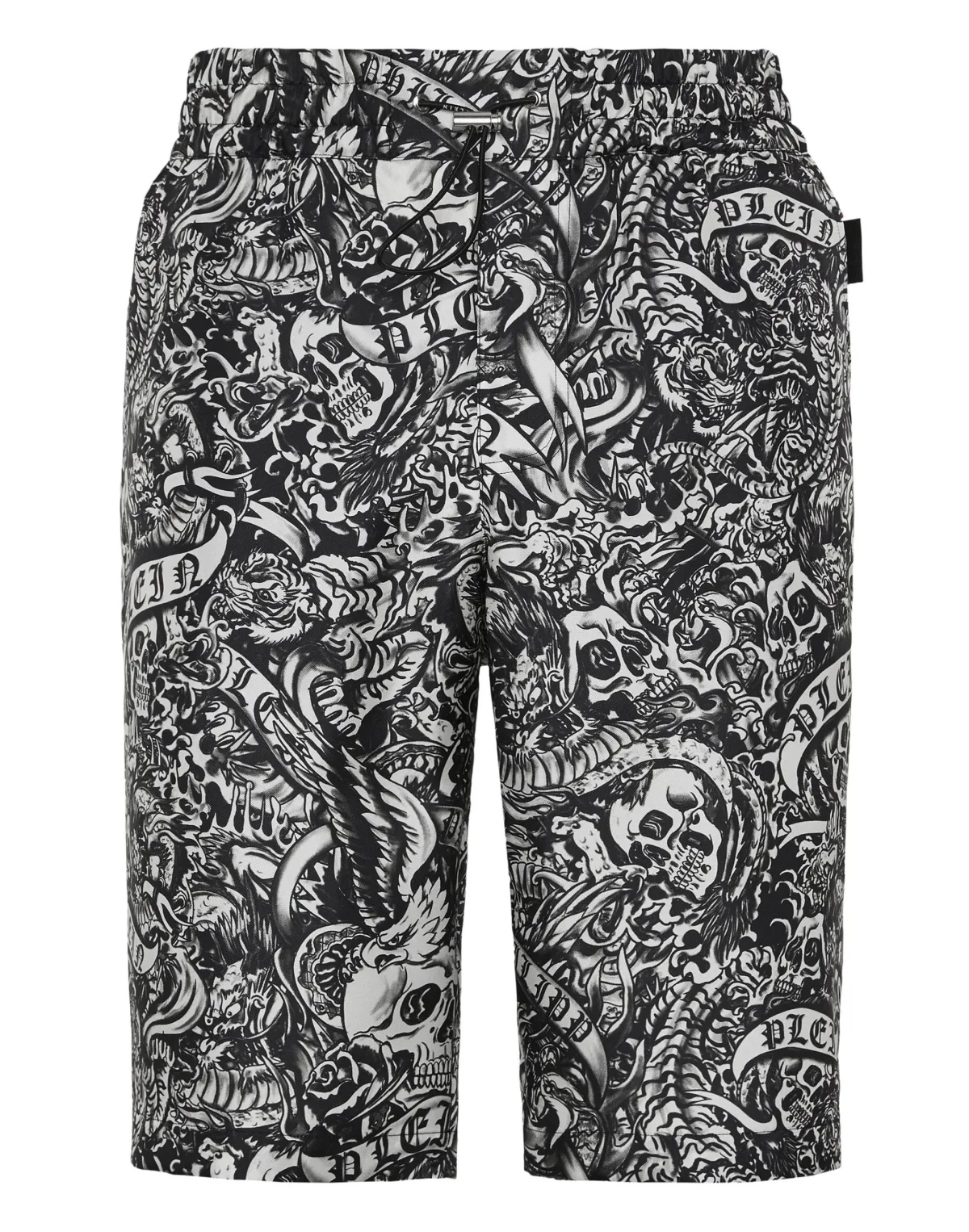 We care for your free time too. We suggest these quite unique silk bermuda shorts. Tattoo print silk twill PP Hexagon on a saffian leather patch sewn on the right rear pocket Slit pockets Elastic waistband with drawstring