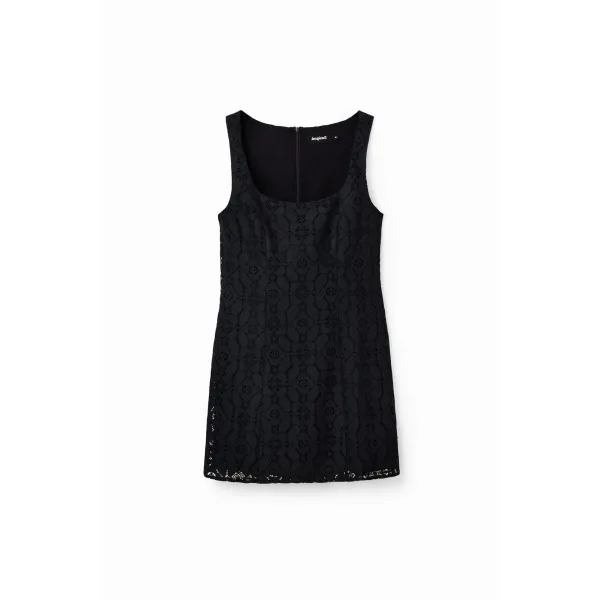 Stap naar buiten, val op en voel je fabulous in deze kanten minijurk. Geniet van moeiteloze elegantie en een vleugje moderne flair, perfect om een statement te maken. De delicate kant zorgt voor een verfijnde uitstraling, terwijl de vierkante halslijn een eigentijdse rand geeft. Het mouwloze ontwerp houdt je koel en zelfverzekerd, ideaal voor warme dagen of avonden uit. Met de onderhoudsvriendelijke constructie biedt deze jurk zowel schoonheid als functionaliteit. Dress het op met hakken of houd het casual met sandalen - het is klaar voor alles.