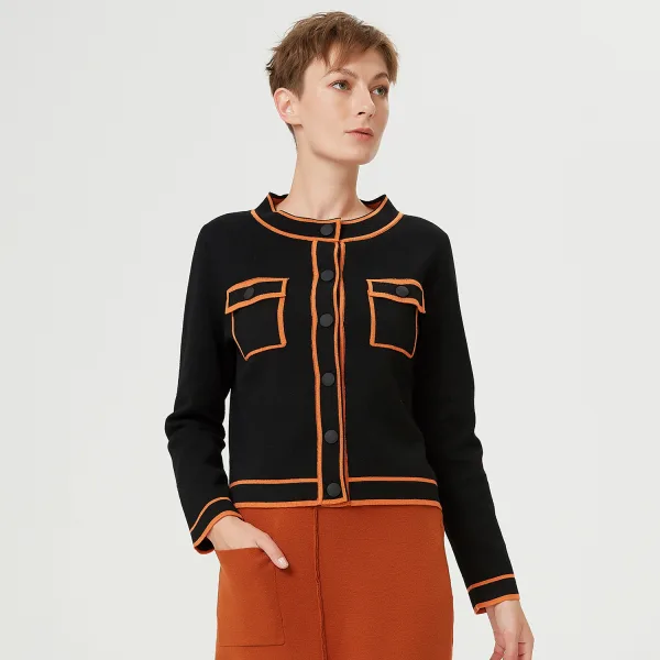 Een grafische en comfortabele snit volledig gestructureerd door contrasterende strepen op de kraag, knoopplacket, patchzakken en polsen. Een jas die een klassieke stijl bekrachtigt en gemakkelijk wordt gedragen met rokken, broeken, blouses en shirts. Productdetails: • vorm: recht • Lengte: 51 cm • Ronde halslijn • Lange mouwen • Knoopsluiting middenvoor