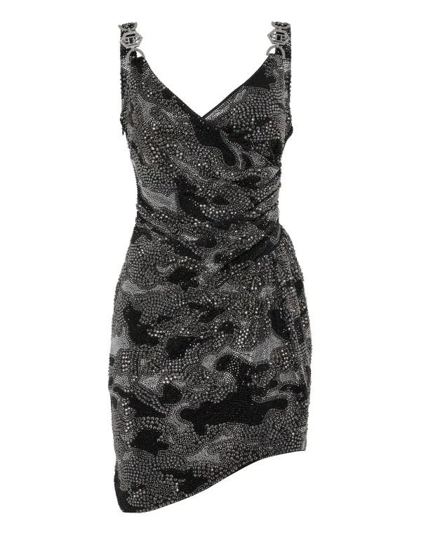 Verfraaid Flatteer je figuur met deze originele jurk met... Bekijk alle details. Geribbelde polyester jersey Halslijn gekenmerkt door een zachte drapering De bandjes zijn versierd met gespjes Wikkelrok met drapering en split opzij Onzichtbare ritssluiting opzij Binnenvoering