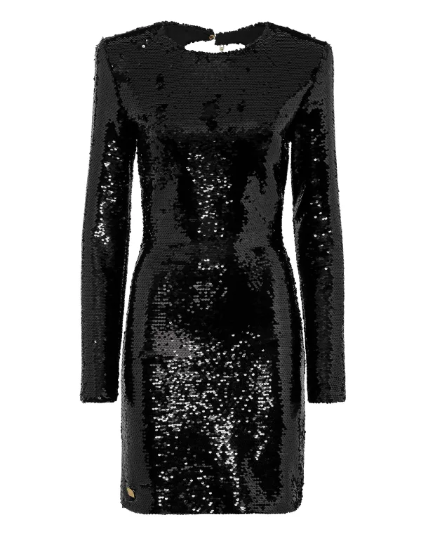 Verfraaid Vier je sensualiteit met deze met strass-steentjes ingelegde jurk van stretchjersey met lange mouwen. De halternek creëert een open rug met strass-juweelversieringen. Onzichtbare ritssluiting middenachter.