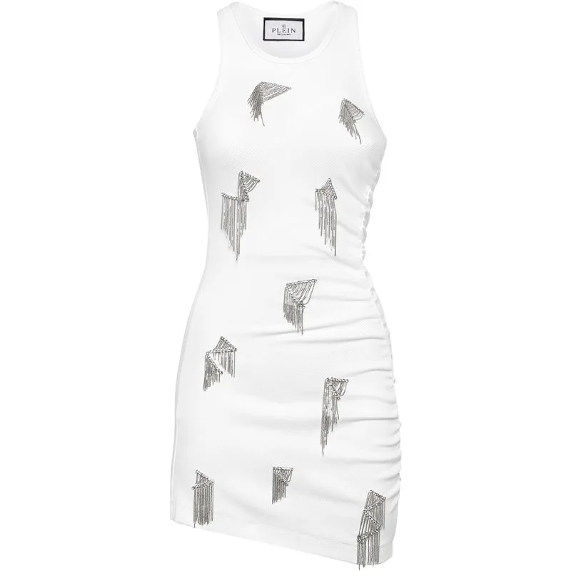 Upgrade your elegance for special times and choose this rib knit jersey slip dress. Check out the details. Rib knit stretch polyester jersey Crystal applications with fringes One side seam with soft pucker