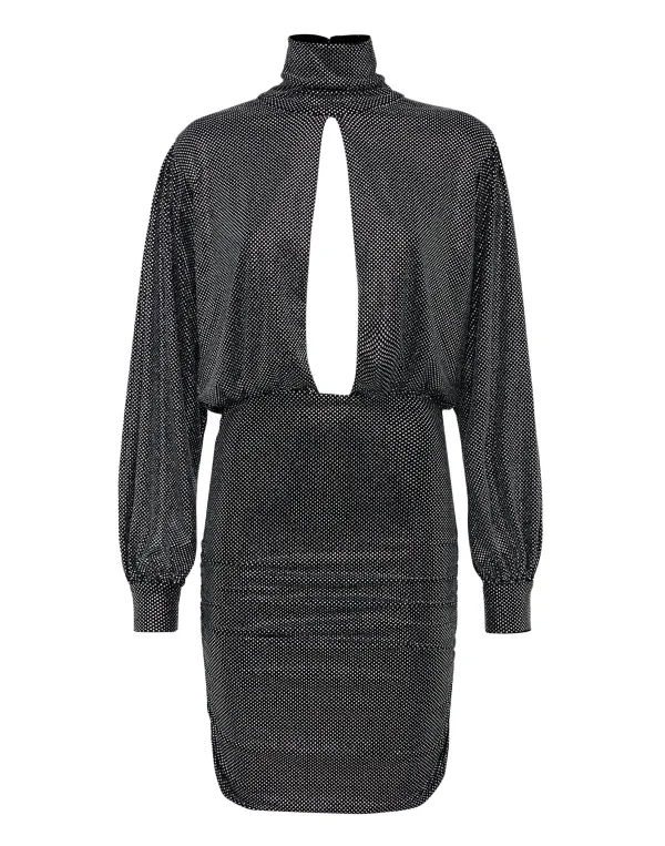Verfraaid De glamour van Hollywood-diva's is terug op deze met microkristallen bezette jersey jurk. De halsuitsnijding loopt over in de drapering, het belangrijkste kenmerk van de rok. Ook de mouwen met manchetten zijn gedrapeerd. Op de rug een opening die wordt samengehouden door de haakjes in de nek en de ritssluiting in het midden.