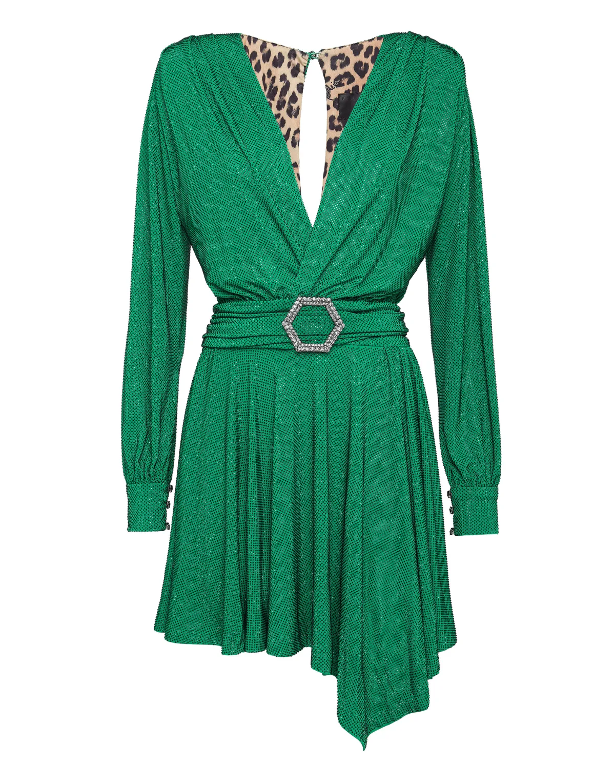 Verfraaid Met strass bezette jurk. Een diep uitgesneden halslijn en lage rug. Pofmouwen met schoudervullingen. Riem met zeshoekige gesp met juwelen in de taille. Asymmetrische rok met onregelmatige plooien. Jewel knopen op manchetten. Binnenvoering met gevlekte print.