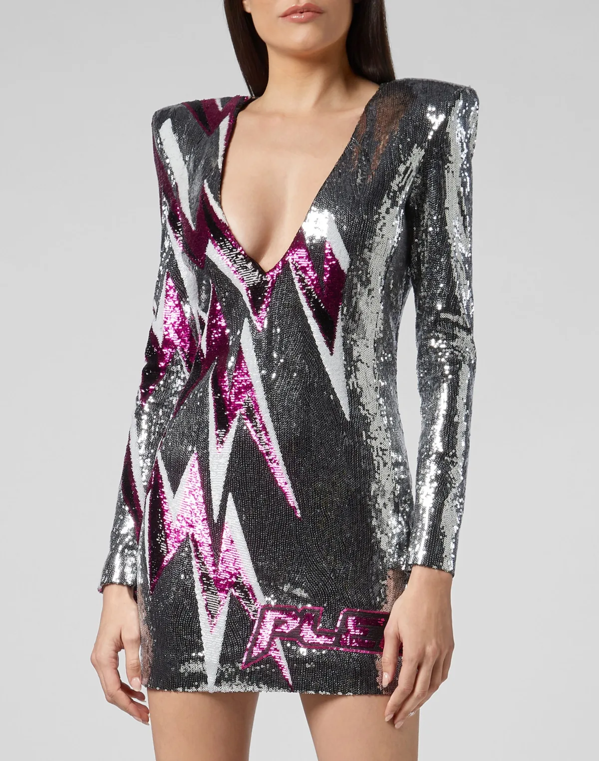 De glamour van de jaren 70 is terug te vinden in deze paillettenjurk versierd met lichtschichtmotieven die doen denken aan Ziggy Stardust en de letters van het merk. Uitlopende halslijn. Ritssluiting middenachter.