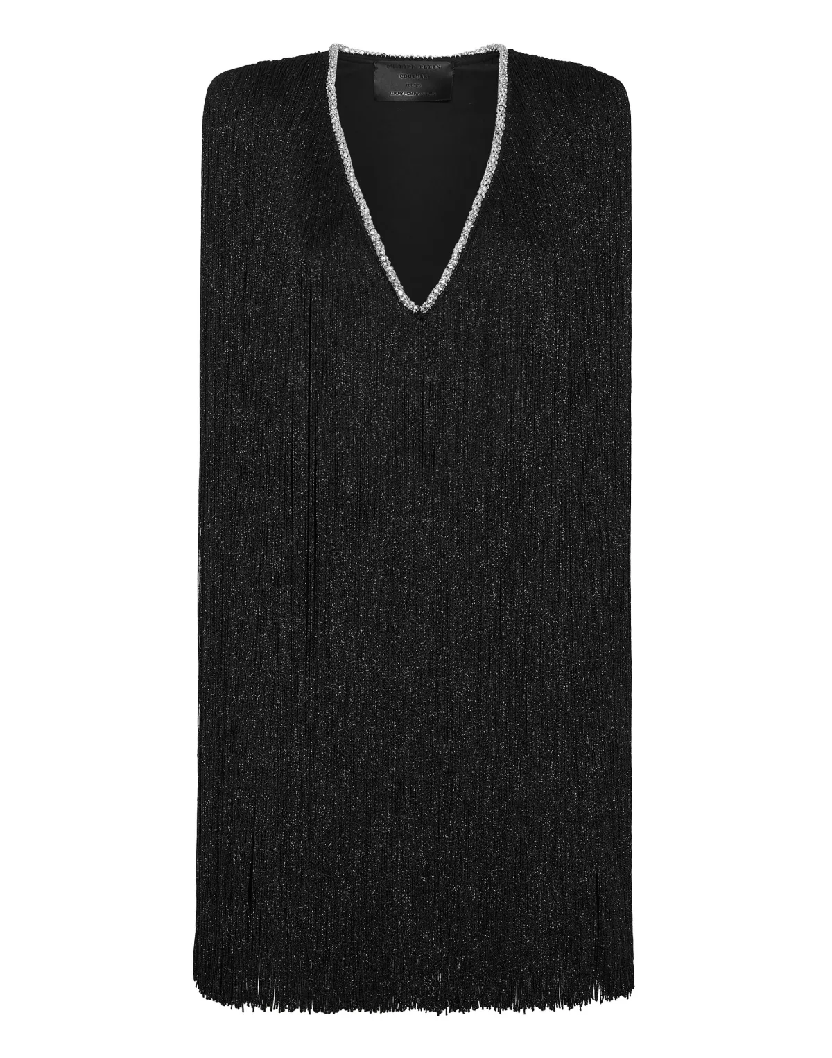 If you’re into the glam look, we suggest this unique and original evening dress. Discover the care for details. Jersey with rayon tassels V-neck with bejeweled trim finish Zip fastener on the side Padded shoulders