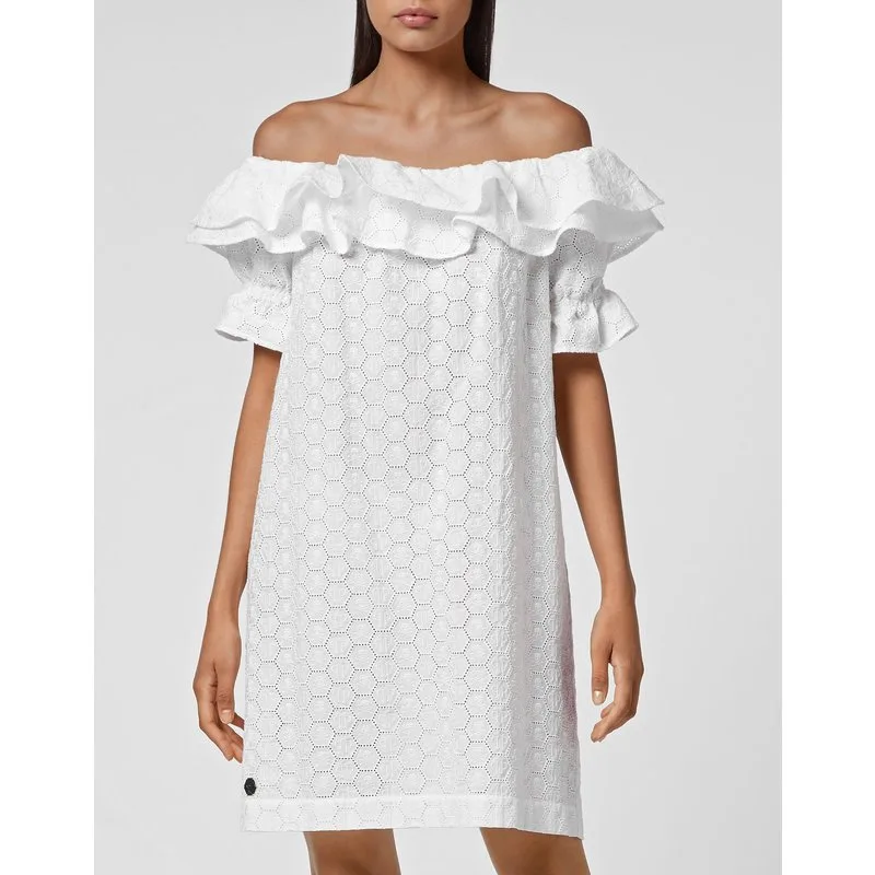 Broderie anglaise katoenen korte off-shoulder jurk met pofmouwen en volants. Onzichtbare ritssluiting middenachter.