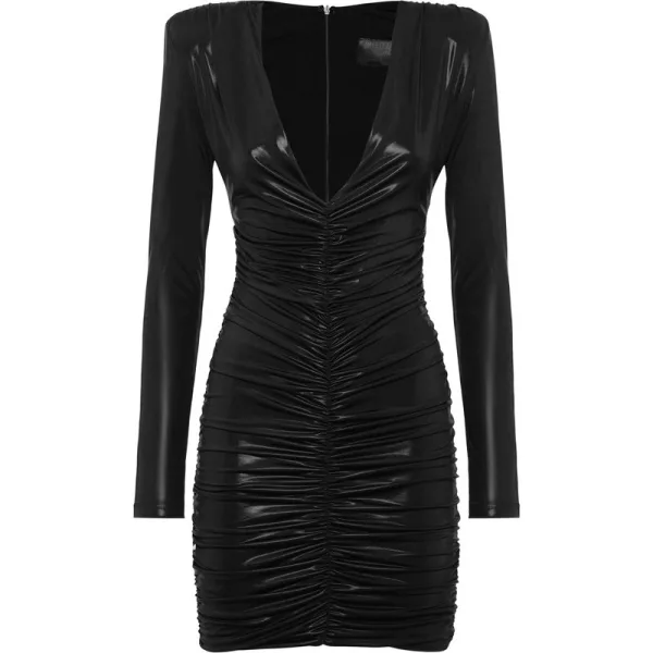 Deze strakke mini-jurk vat moeiteloos de essentie van moderne verfijning met zijn nauwsluitende silhouet en glanzende afwerking, perfect om een statement te maken op elk evenement. Vervaardigd van eersteklas stretchstof voor een onberispelijke, figuurverbeterende pasvorm. Overal gerimpelde details die textuur toevoegen en het silhouet benadrukken. Lange mouwen en diepe V-hals brengen elegantie en allure samen. Veelzijdig ontwerp geschikt voor glamoureuze avonden of gedurfde dagkleding. Lichtgewicht en ademend materiaal zorgt voor comfort zonder afbreuk te doen aan stijl.