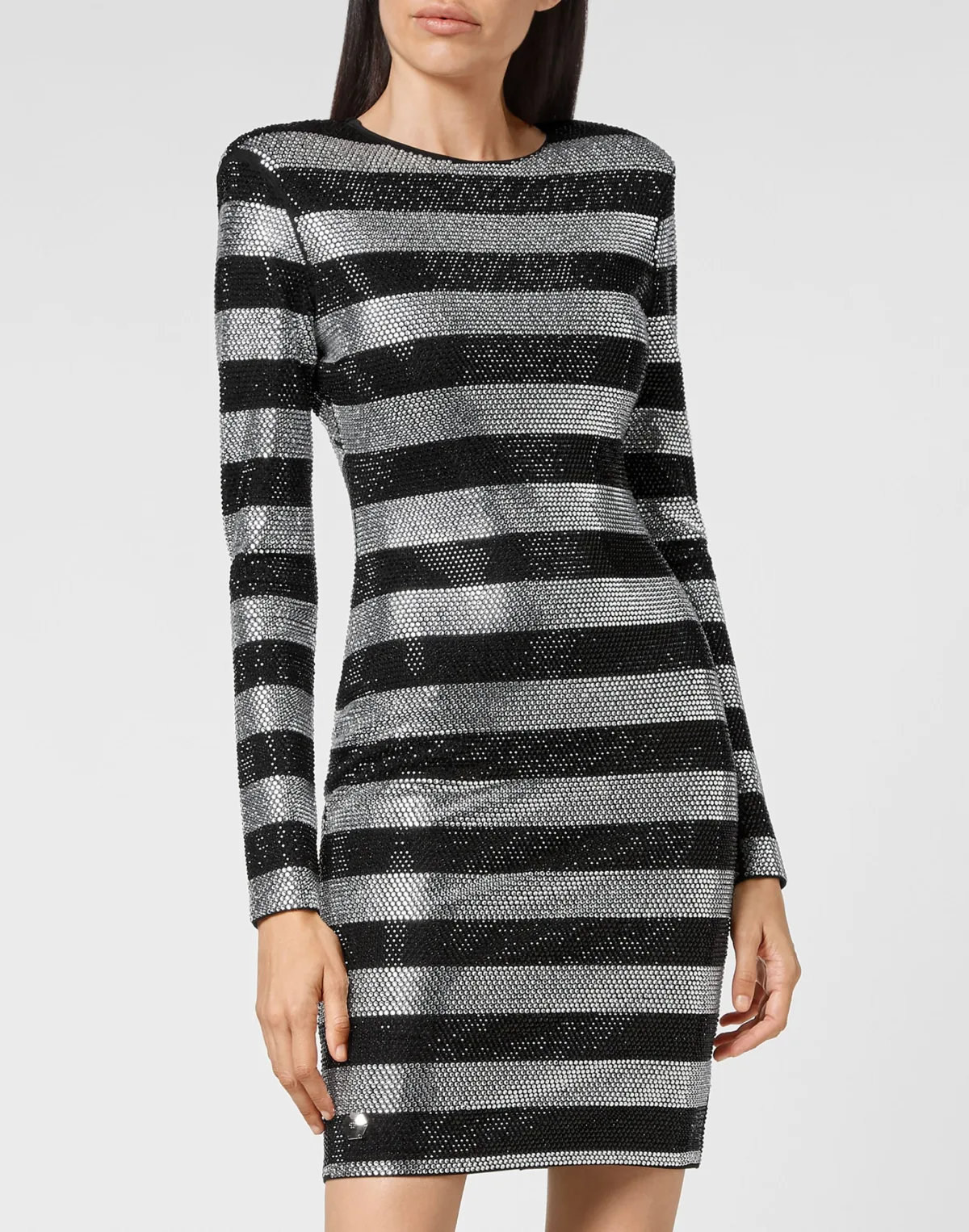 Verfraaid Stretchjurk van viscosemix jersey met lange mouwen en strassteentjes. Het heeft een overduidelijk streeppatroon en een brede traanvormige keyhole met juweelknoop op de rug. Onzichtbare ritssluiting middenachter.