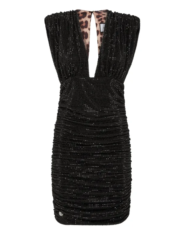Verfraaid Speciale evenementen vragen om unieke kleding. Wij adviseren deze gedrapeerde jurk van stretch lycra met... Ontdek meer. Stretchlycra Geprononceerde halslijn tot aan de taille met een hoge sjerp Gewatteerde schouders Kraag met haaksluiting en open rug Onzichtbare ritssluiting middenachter