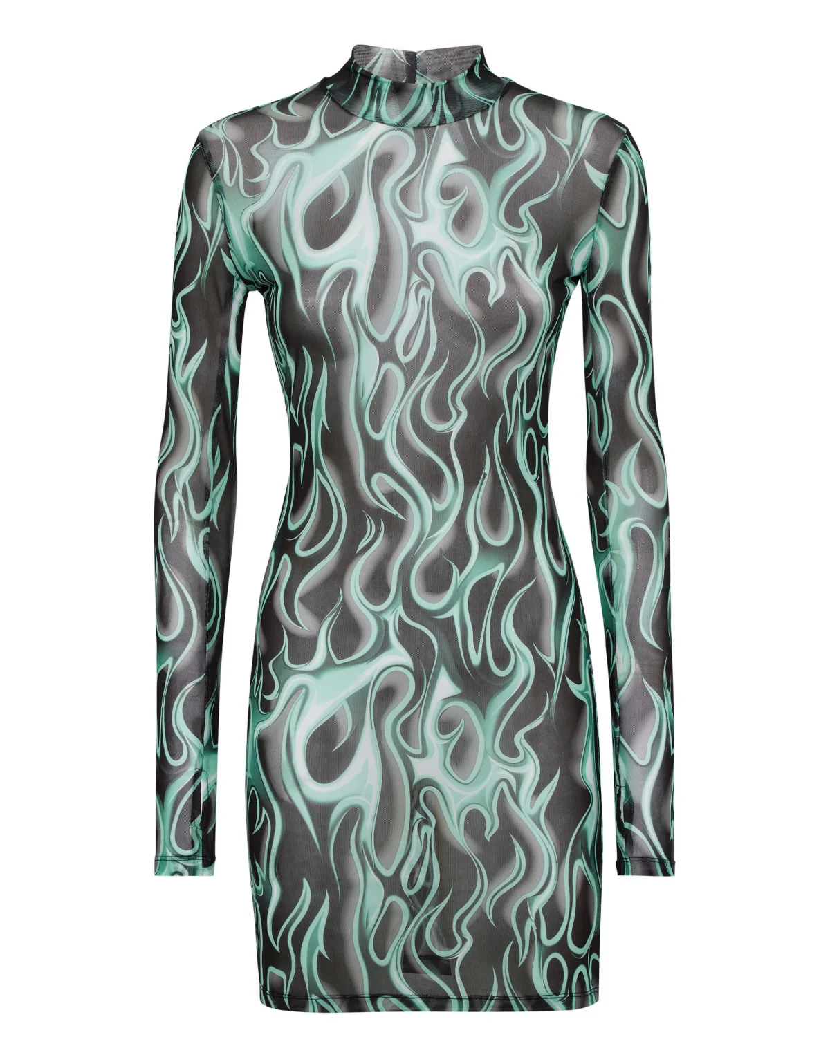 Upgrade your elegance for special times and choose this jewelled tulle long sleeves dress. Check out the details. Stretch polyester tulle All over printed with flame print Thumbhole High neck