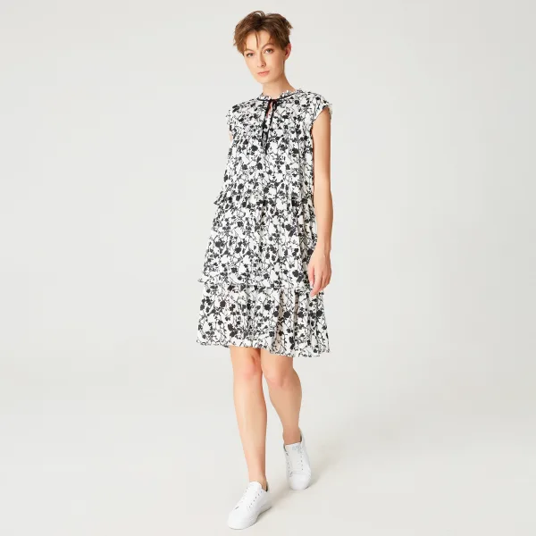 Een romantische en lichte "Baby Doll" -jurk, gestructureerd met drie grote gelaagde ruches. Licht gestructureerde stof met een monochrome bloemenprint, kraag versierd met verzamelingen en een zwart lint om te binden. Je kunt de "meisjesachtige" kant volledig spelen door hem te dragen met ballerina's of sneakers en een witte spijkerjasje of het een meer glamoureuze kant geven met hakken en een zwarte blazer. In het middenseizoen kan het een tuniek worden met een paar leggings. Productdetails • Vorm: trapeze • Zonder mouwen • Hoge kraag • Elastisch op taille • Lengte: 98 cm