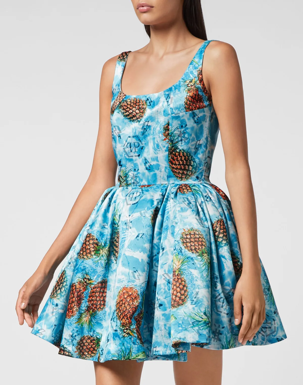 Zijden jurk met hertoginnenbandjes in ananasprint. De jurk heeft een wijd uitlopende rok en studs op de bandjes. Verborgen ritssluiting middenachter.