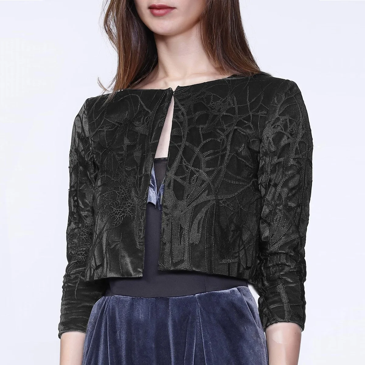 Dit korte jas bestaat uit een laag verfijnde kant bovenop en een fluwelen stof onder die een subtiel glanzend effect heeft. Gesloten rand tot Edgewith een eenvoudige haak aan de voorkant. Het stuk is volledig bekleed met een enigszins stretch satijnen stof, waardoor zachtheid en comfort wordt gebracht. Een zeer praktische aanvulling op uw garderobe om uw mouwloze avondjurken te accessoriseren. Productdetails: Vorm; direct Lengte: 44 cm 3/4 mouwen Ronde nek Haken midden vooraan