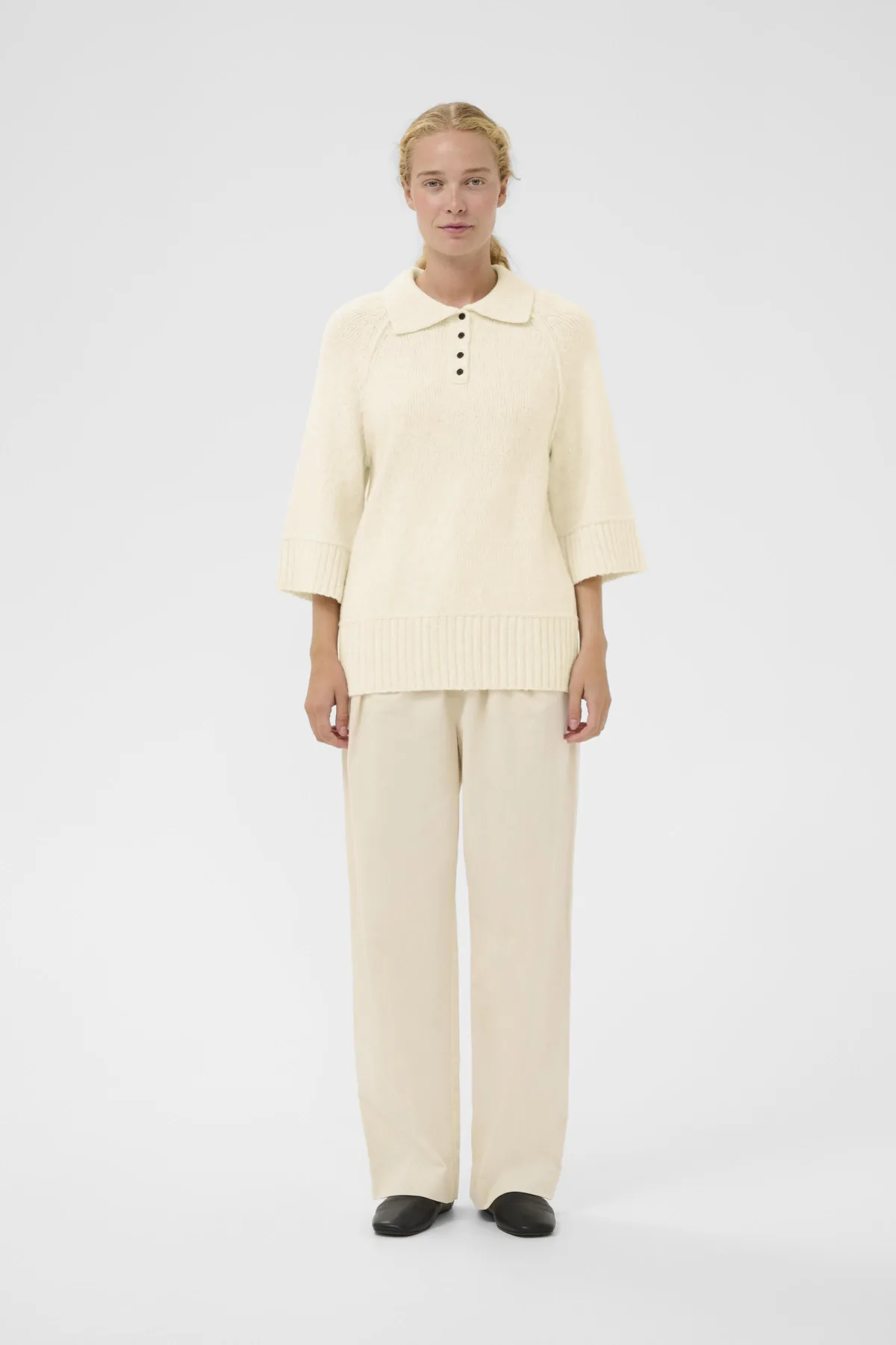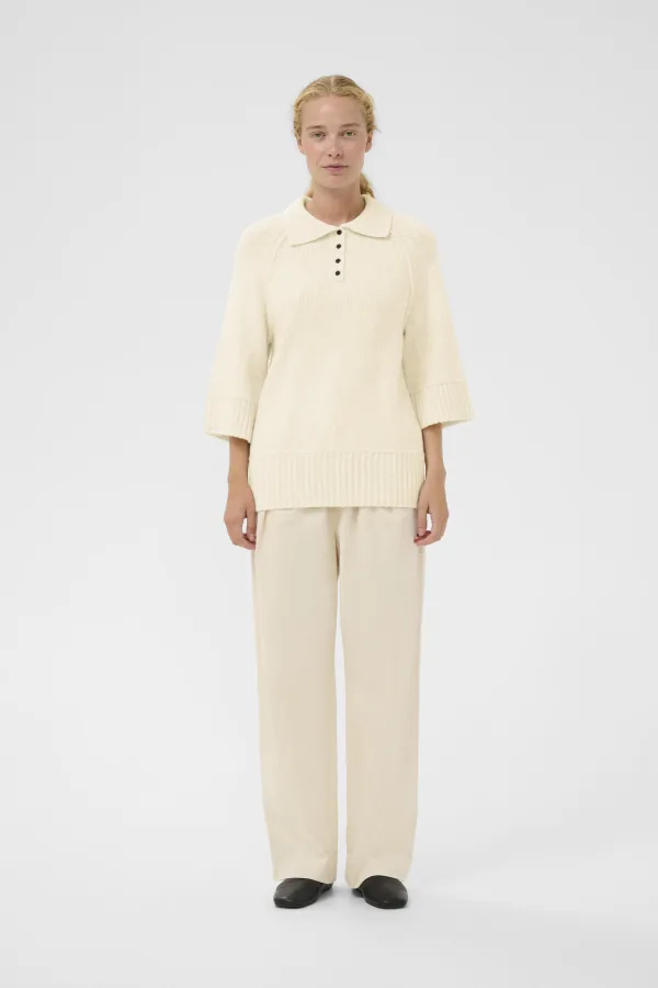 Deze trui heeft een rechte pasvorm, polokraag met knoopsluiting, halflange wijde mouwen en ribbels aan zoom en manchetten voor een tijdloze look.
