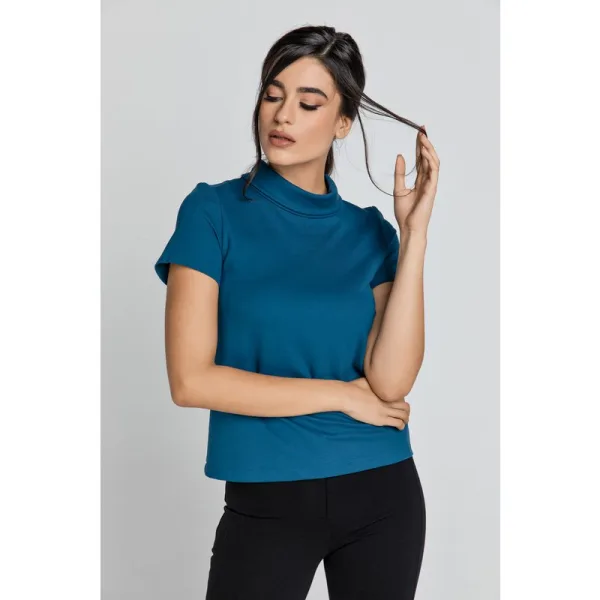 Petrolblauwe top van rekbare stof. Lage omvouwbare col en korte mouwen. Pendokken bij de buste. Sluit aan de achterkant met een dikke plastic rits in dezelfde kleur. Rechte silhouet. Ons model is 176 cm en draagt maat 36/S. Maten voor maat 36/S (in cm): Schouder - 36, Borst - 43, Taille - 44, Onderkant - 48, Mouwlengte - 16, Lichaamslengte - 57. Accessoires zijn niet inbegrepen. 70% viscose - 25% polyamide - 5% elastan.