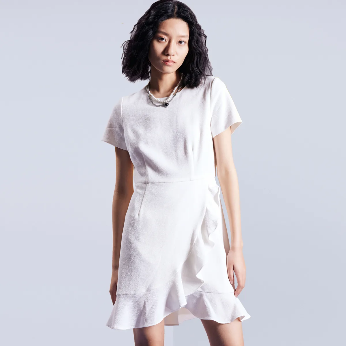 Een minimalistische en casual stijl, dit stuk is gestructureerd met een eenvoudig lijfje in de vorm van een T-shirt en een omgekomen rok. De look kan eenvoudig blijven met een paar sneakers of kan worden gekoppeld aan panty's, laarzen en een motorjack. Productdetails: • Vorm: trapeze • Lengte: 100 cm • Korte mouwen • Rond kraag • Invisible Zipper Center Back