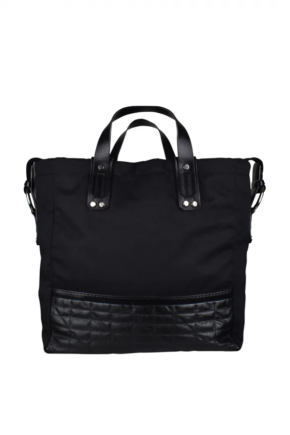 Nationale draagtas van zwart nylon.Zwart leren handvatten en onderkant.Metalen logoplaatje aan de onderkant van de tas.Afneembare, verstelbare schouderriem.Binnenvakken, waarvan één met ritssluiting.Gemaakt in Italië.