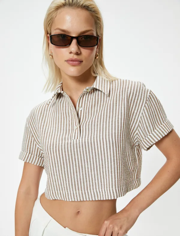 Blouse type: Wijde blouse; Design: Gevoerde zoom/rand, Mouw revers; Type sluiting: Knoopsluiting; Motief: Gestreept; Kraag: Kentkraag; Extra's: All-over patroon, Gladde stof; Pasvorm: Losse pasvorm; Armlengte: Kwartmouw; Lengte: Korte pasvorm