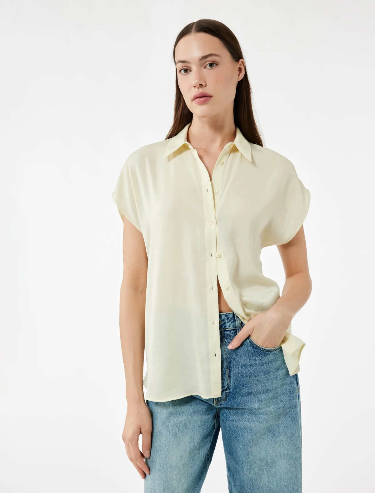 Blouse type: Klassieke blouse; Design: Gevoerde zoom/rand, Gesneden mouw, Knop placket; Type sluiting: Knoopsluiting; Materiaal: Satijn; Motief: Effen; Kraag: Kentkraag; Details: Plooien; Extra's: Licht transparant, Op staal naden; Pasvorm: Losse pasvorm; Armlengte: Kwartmouw; Lengte: Normale lengte