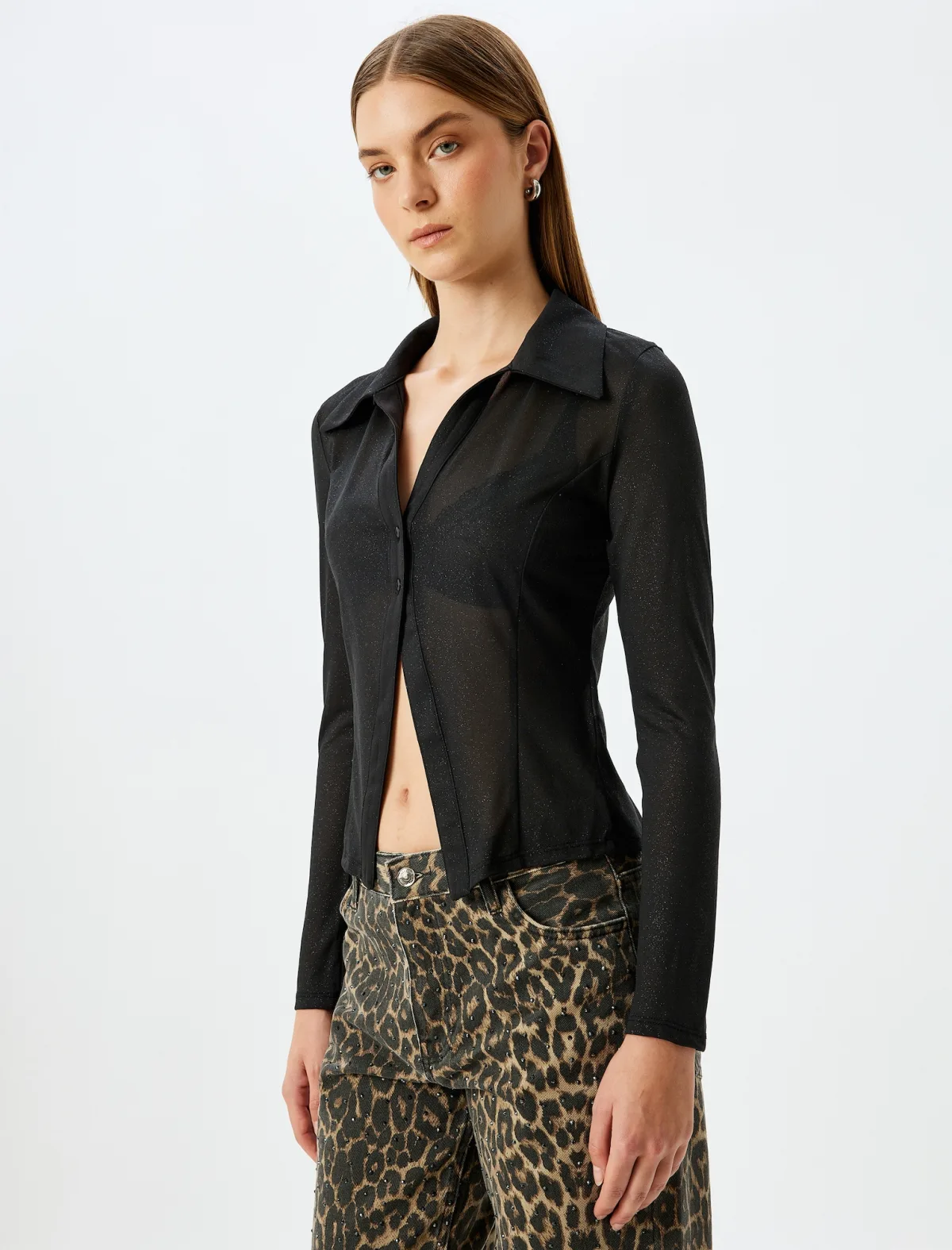 Blouse type: Klassieke blouse; Design: Gevoerde zoom/rand, Placket; Type sluiting: Knoopsluiting; Motief: Effen; Kraag: Kentkraag; Extra's: Licht transparant, Glinsterend; Pasvorm: Slanke pasvorm; Armlengte: Lange mouw; Lengte: Normale lengte