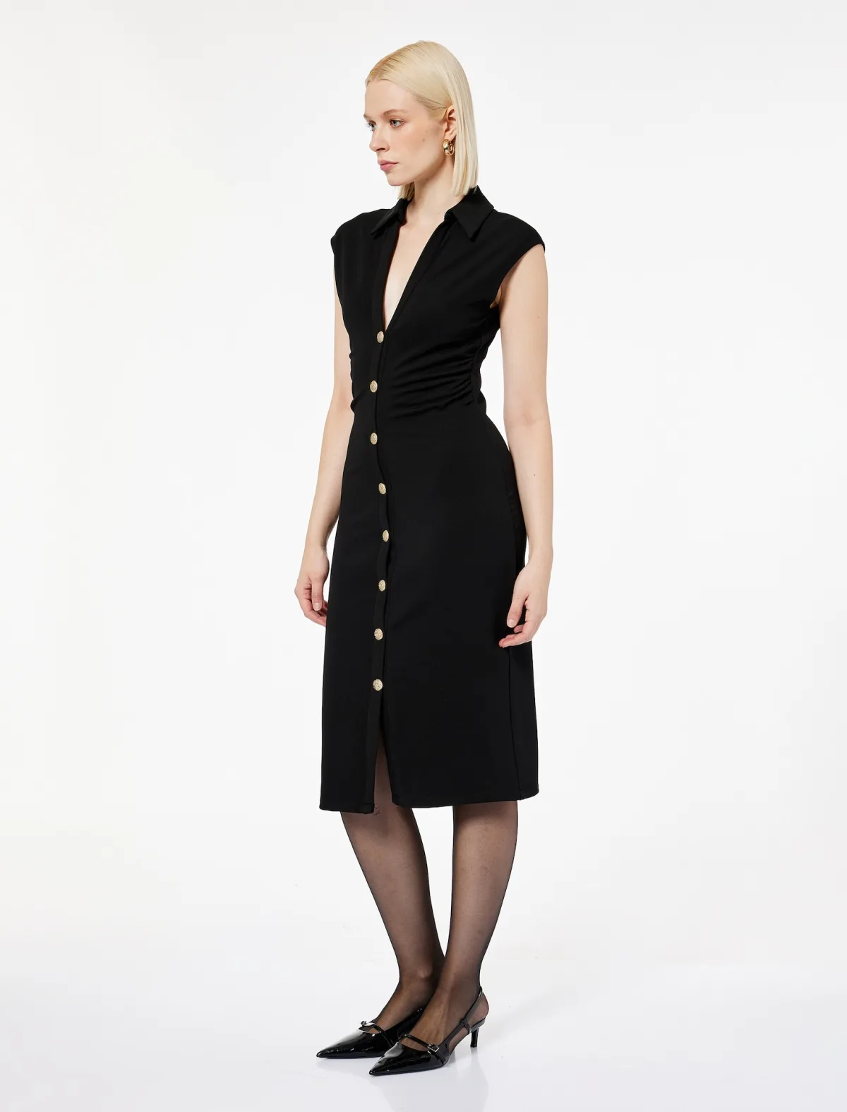 Design: Placket; Type sluiting: Knoopsluiting; Halstype: V-hals; Motief: Effen; Details: Gedrapeerd; Extra's: Op staal naden; Lengte: 3/4 lengte; Pasvorm: Slanke pasvorm; Armlengte: Mouwloos