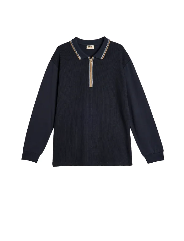 Design: Geribd ceintuurtje, Contrasterende inserts, Halve rits; Type sluiting: Ritssluiting; Materiaal: Jersey; Halstype: Polokraag; Motief: Effen; Extra's: Met textuur, Voelt zacht aan; Pasvorm: Normale pasvorm; Armlengte: Lange mouw