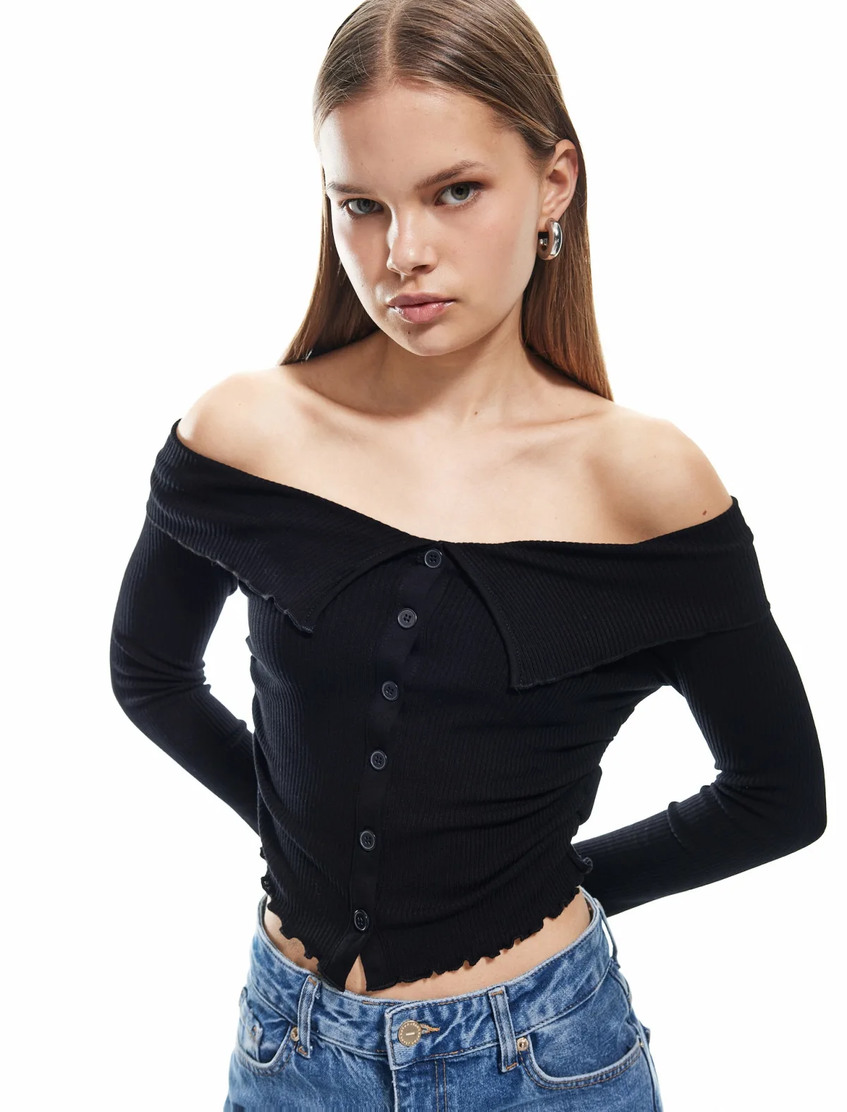 Design: Placket; Type sluiting: Knoopsluiting; Materiaal: Viscose; Halstype: Carmen hals; Motief: Effen; Extra's: Op staal naden; Pasvorm: Aansluitende pasvorm; Armlengte: Lange mouw; Lengte: Normale lengte