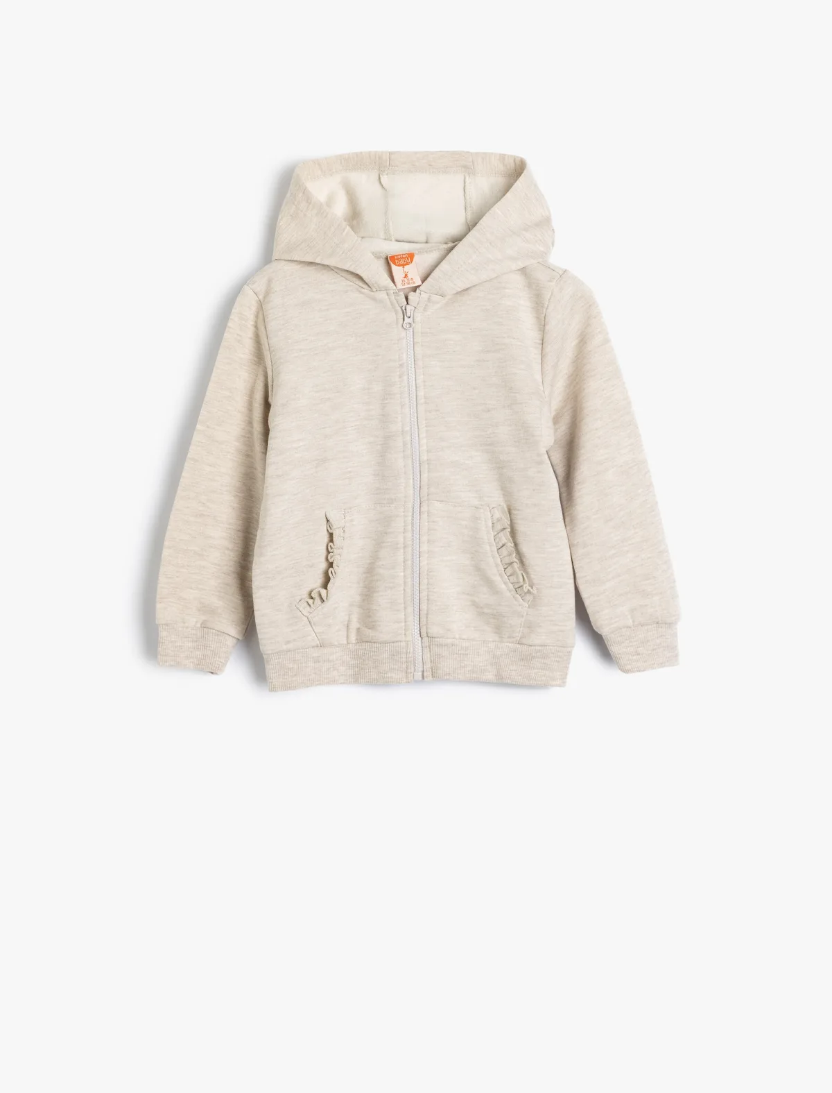Design: Geribd ceintuurtje, Kangaroo zak; Type sluiting: Ritssluiting; Materiaal: Sweatstof; Halstype: Capuchon; Motief: Mélange; Details: Ruches; Extra's: Voelt zacht aan; Pasvorm: Normale pasvorm; Armlengte: Lange mouw; Lengte: Normale lengte