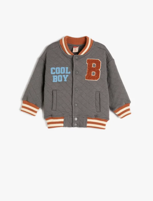 Design: Geribd ceintuurtje; Type sluiting: Drukknoop; Type jas: Bomberjack; Voering: Niet gevoerd; Materiaal: Katoen; Motief: Tekst print; Extra's: Applicaties; Pasvorm: Normale pasvorm