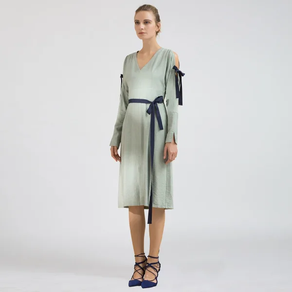 Edgy en moeiteloos, deze jurk een geweldige stijlverklaring voor de zomer. Speelachtige "Gros Grain" bogen op mouwen en taille hebben een vleugje verfijning. De vleermuismouwen, V-klare en gemonteerde taille brengt een echt elegant silhouet naar je figuur en houdt het item gemakkelijk te dragen. Mooie gestructureerde viscose flanel bekleed met een zeer zachte 100%katoenen voering. Combineer het met ballerina's voor een heupdag of met hakken sandalen voor chique avonden. Bestaat in mintgroen of lichtroze. Productdetails: • V halslijn • Lange vleermuismouwen • Midi Lengte: 110 cm • Terug verborgen rits en knop