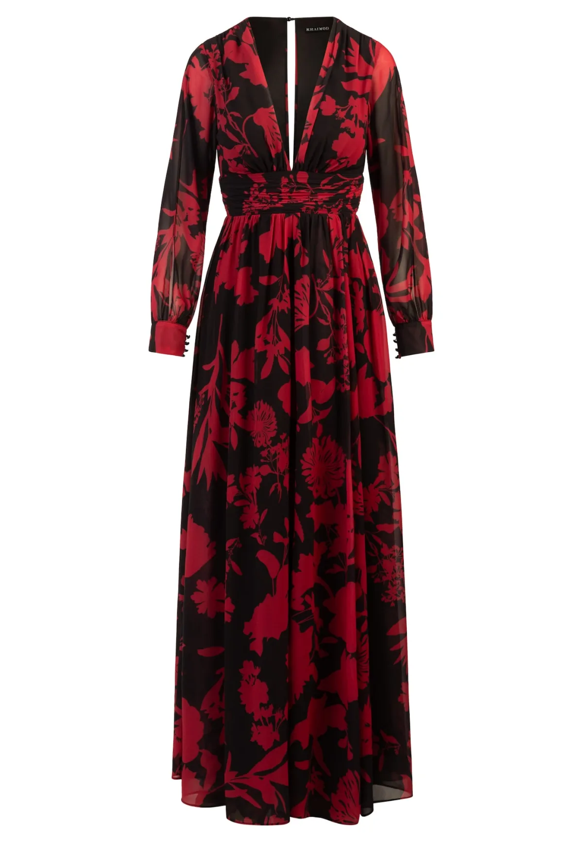 Design: Tailleband, Verborgen rits; Type sluiting: Ritssluiting; Halstype: V-hals; Motief: Bloemenprint; Details: Cut-outs, Gedrapeerd; Extra's: All-over patroon; Lengte: Lang/maxi; Snit: Uitlopend; Pasvorm: Normale pasvorm; Armlengte: Lange mouw