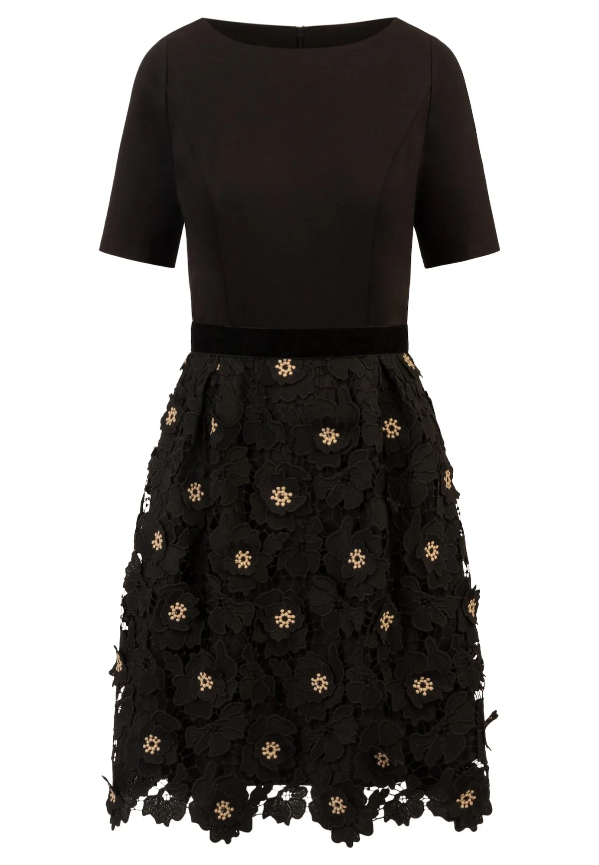 Design: Ritssluiting, Tailleband; Type sluiting: Ritssluiting; Materiaal: Viscose; Halstype: Boothals; Motief: Bloemenprint; Details: Kant; Extra's: Op staal naden; Lengte: Knielengte; Pasvorm: Slanke pasvorm; Armlengte: Kwartmouw