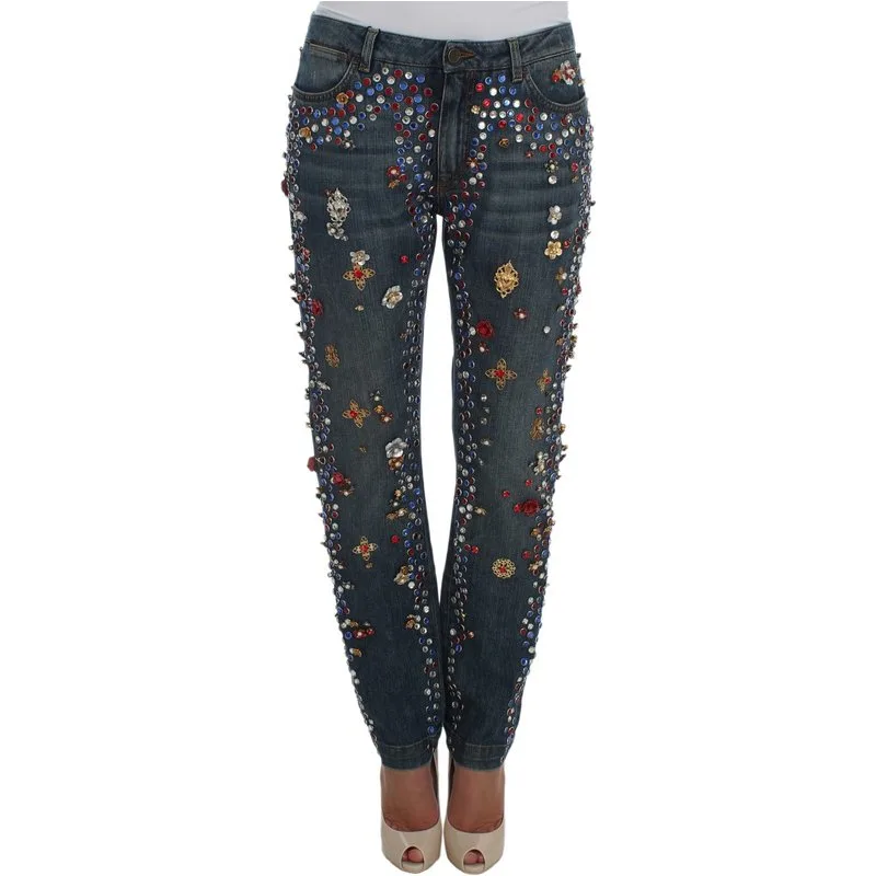 Stap naar voren, straal helder en steel de show. Deze Dolce & Gabbana jeans transformeren alledaagse denim in een schitterende uitstalling van haute couture. Ervaar de ultieme luxe met zorgvuldig geplaatste meerkleurige crystals en studs in goudkleur. De premium denimconstructie zorgt voor blijvende kwaliteit, terwijl de unieke versieringen je stijl naar een hoger niveau tillen. Perfect om een statement te maken, deze jeans combineren moeiteloos comfort en extravagantie. Trek de aandacht en bezit de nacht in deze onvergetelijke jeans.