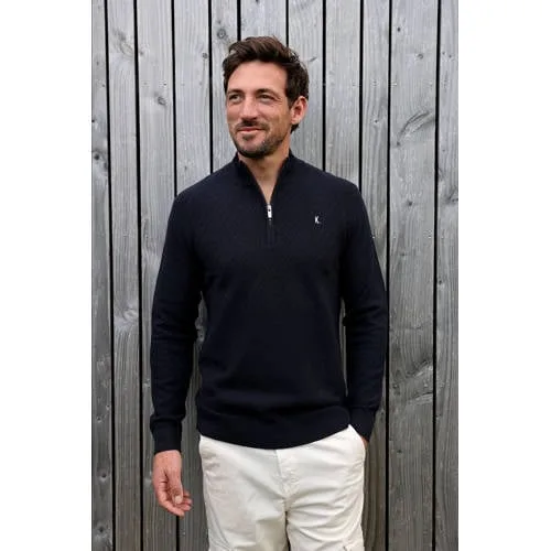 Deze KN CROSSED ZIP trui van Kultivate heeft een regular fit en lange mouwen. Deze trui is gemaakt van 100% katoen, heeft een opstaande kraag en een korte rits. De trui heeft borduursels, een ingebreid patroon en geribde boorden.