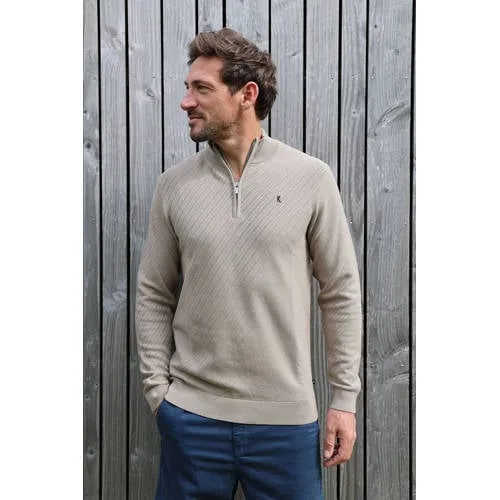 Deze trui van Kultivate heeft een regular fit en lange mouwen. De stof is gemaakt van 100% katoen met een opstaande kraag en korte rits, ingebreid patroon, gebreide textuur, geribde boorden en borduursels.