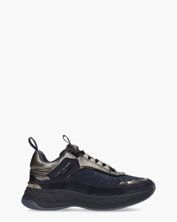 Damessneakers Kensington C Sneaker 2638185609 uit de collectie van Kurt Geiger. Deze sneakers hebben een bovenwerk gemaakt van meerdere structuren zoals donkerblauw suede, zilvergrijs metallic leer en met kristalletjes versierde stof. Op de tong vind je het kenmerkende strass eaglekopje. De blauwe 4 cm hoge zool is van rubber gemaakt. De