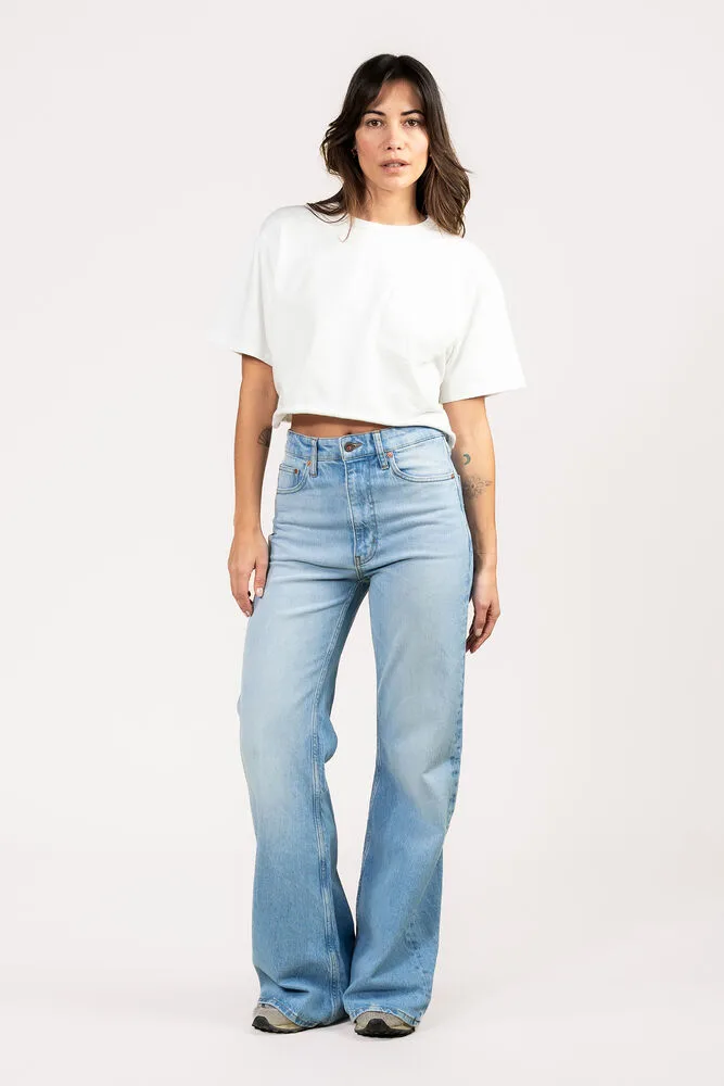 De Vivienne van Kuyichi is een flared fit jeans, dit 5-pocket model valt aansluitende op de heupen en bovenbenen en heeft wijd uitlopende pijpen vanaf de knie. Deze jeans heeft een hoge taille en sluit met een knoop- en ritssluiting. Dit item is gemaakt van 67% biologisch katoen, 30% pre-consumer gerecycled katoen, 2% gerecycled polyester en 2% elastaan.