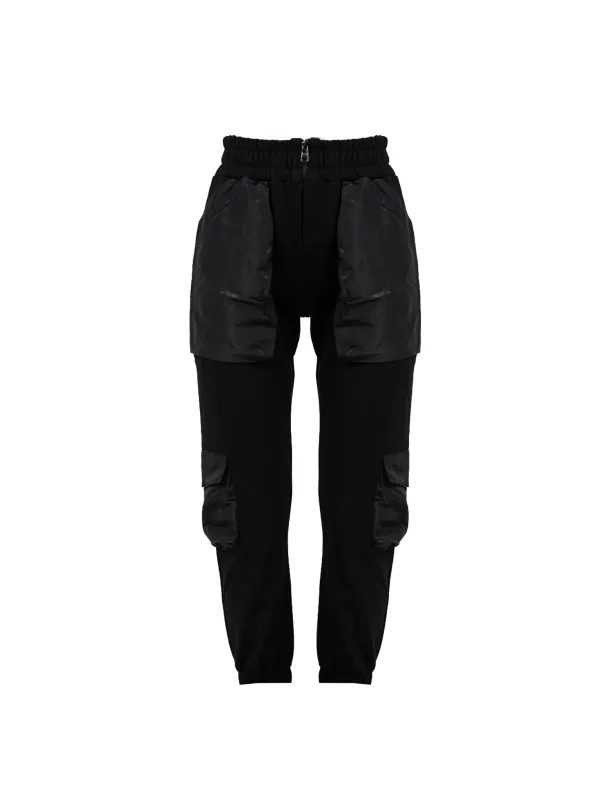 Eenvoudig model Met ingenaaid elastiek in de taille, ook te sluiten met een rits Met een mid-rise taille Twee zakken aan de voorkant, extra zakken op de benen Gemaakt van een combinatie van stoffen Beenzomen met manchetten Gemaakt van hoogwaardige stof Gemaakt in Italië