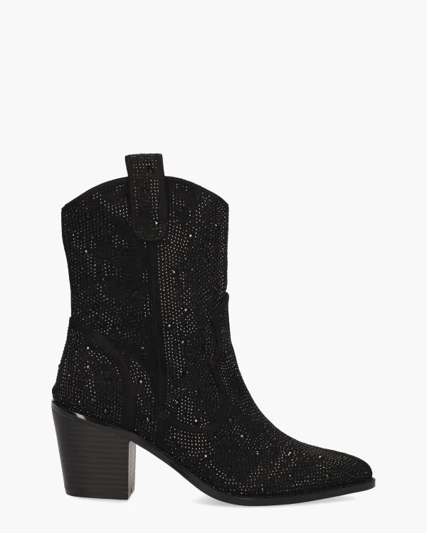 De enkelboots Usha voor dames van Mia&Jo stralen stoere elegantie uit. Deze halfhoge Westernlaars heeft een spitse leest en een bovenwerk van imitatiesuède. All-over mini strass-steentjes voegen een stijlvolle touch toe. Met een handige ritssluiting aan de zijkant van de circa 15,5 cm hoge schacht trek je de laarsjes eenvoudig aan. De