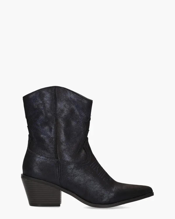 De Cowboystyle enkelboots Vlinder van Mia&Jo voegen een vleugje stoere elegantie toe aan je outfit. Deze laarzen, uitgevoerd in donkerblauw metallic kunstleer, trekken de aandacht door hun robuuste maar verfijnde uitstraling. De 14,5 cm hoge schacht is prachtig gedecoreerd met klassieke Cowboy-stitching, wat de laarzen een authentiek