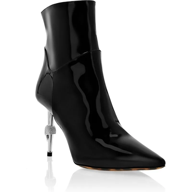 Deze enkellaarsjes zijn gemaakt van lak. De juweelversie van de iconische schedel is letterlijk "gespiest" op de ijzeren naaldhak. Binnenvoering. Animalier patroon zool. Hak: 80 mm.